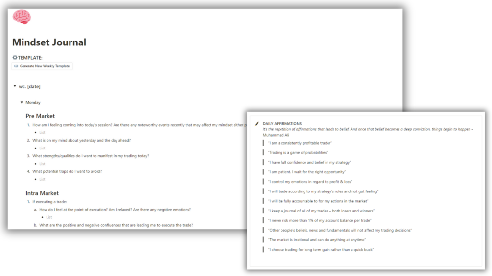 - Mindset Journal: Develop a disciplined and focused trading mindset with our psychology journaling feature. Reflect on your emotions, thoughts, and mental state before, during, and after trades to enhance your decision-making process.
