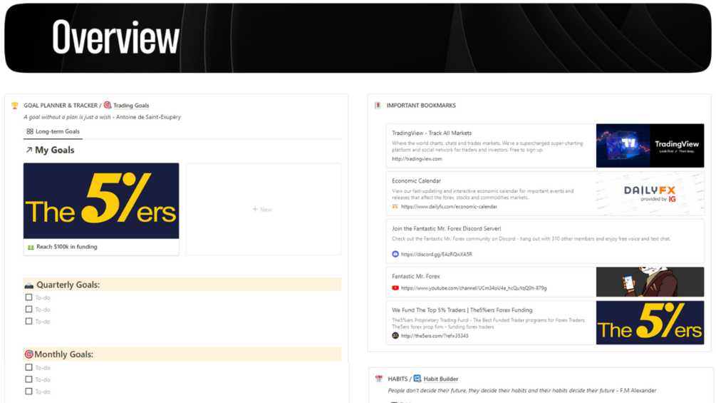Welcome to the ultimate trading dashboard, your all-in-one solution to unlock trading excellence and achieve your financial goals. This comprehensive platform provides you with an array of powerful tools and resources to enhance your trading strategy, track your progress, and foster a winning mindset. Let's take a closer look at its remarkable features (more detailed walkthrough available on YouTube):